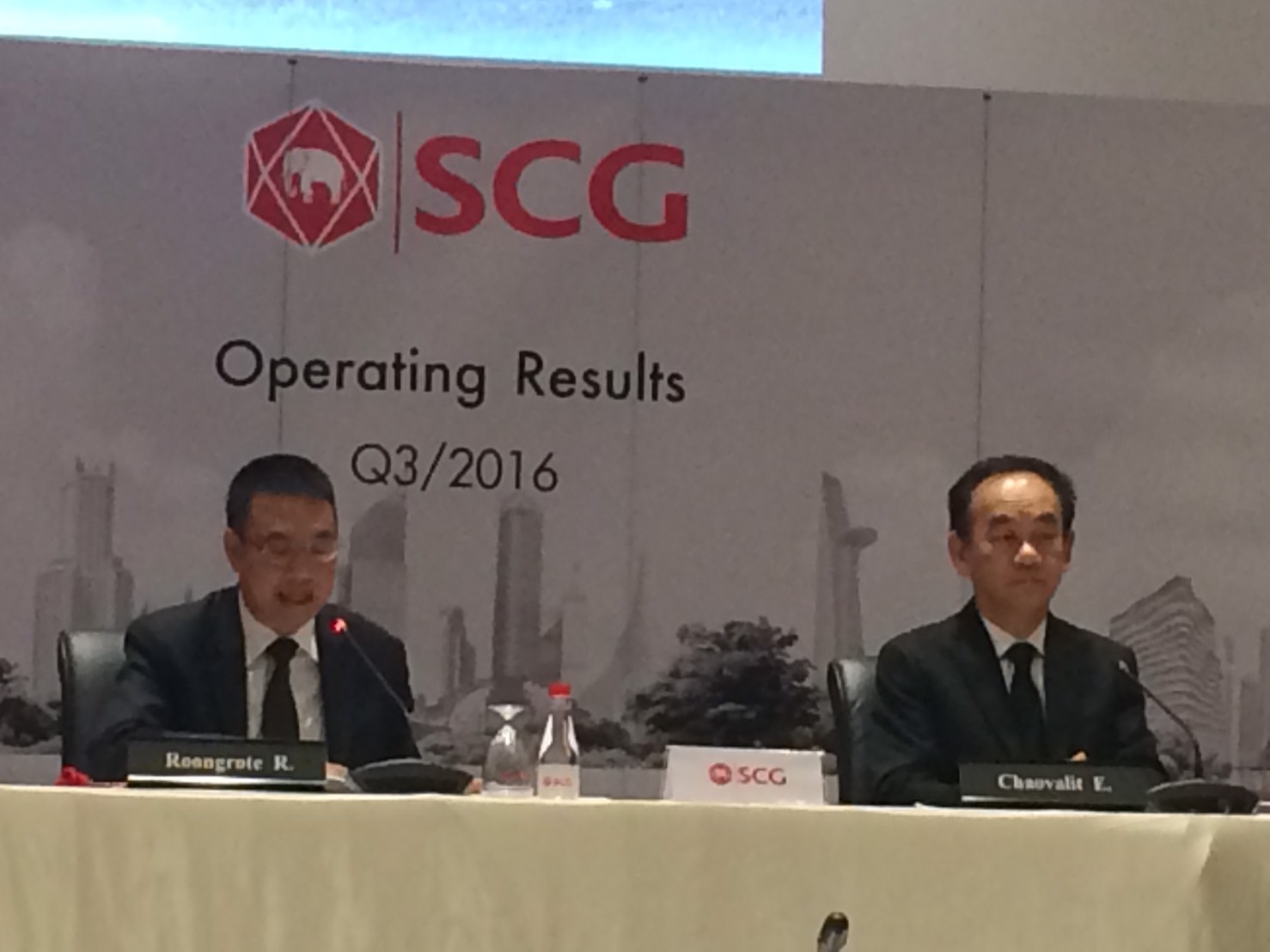 นายรุ่งโรจน์ รังสิโยภาส กรรมการผู้จัดการใหญ่ เอสซีจี เปิดเผยว่า ผลประกอบการช่วง 9 เดือนแรกของปี 59 เอสซีจีมีรายได้รวม 323, 829 ล้านบาท ลดลงร้อยละ 3 จากช่วงเดียวกันของปีก่อน จากความต้องการปูนซีเมนต์ในประเทศชะลัวตัว รวมทั้งราคาเคมีภัณฑ์ลดลลงตามราคาตลาดโลก จึงมีกำไร 43,606 ล้านบาท เพิ่มขึ้นร้อยละ 28 จากช่วงเดียวกันของปีก่อน หลังจากผลประกอบการไตรมาส 3 มีรายได้จากการขาย 104,957 ล้านบาท ลดลงร้อยละ 5 ปัจจุบันมีทรัพย์สินรวม 528,395 ล้านบาท