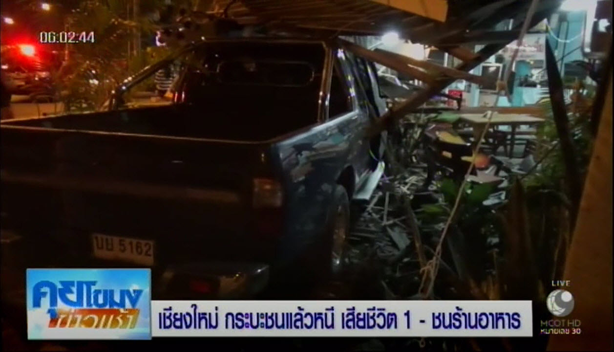 เชียงใหม่ 12 ธ.ค.-หนุ่มวัยเบญจเพสซิ่งรถกระบะพุ่งชนรถกระบะที่จอดข้างทางจนล้อหลุด ชายที่ยืนโทรศัพท์อยู่ข้างรถเสียชีวิต 1 ราย แล้วขับหลบหนี จนเสียหลักพุ่งชนร้านอาหารกลางเมืองเชียงใหม่ ทำให้มีผู้ได้รับบาดเจ็บอีก 4 ราย