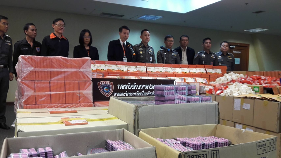 พลตำรวจตรีประเสริฐ พัฒนาดี ผู้บังคับการปราบปรามการกระทำผิดเกี่ยวกับการคุ้มครองผู้บริโภค หรือ ปคบ. พร้อมนายประพนต์ อางตระกูล รองเลขาธิการคณะกรรมการอาหารและยา หรือ อย. ร่วมกันแถลงจับกุมยาลดความอ้วนปลอมยี่ห้อ paya slim plus รวมมูลค่ากว่า 5 ล้านบาท