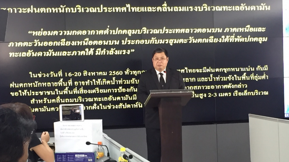 นายวันชัย ศักดิ์อุดมไชย อธิบดีกรมอุตุนิยมวิทยา เปิดเผยว่า เนื่องจากหย่อมความกดอากาศต่ำปกคลุมบริเวณประเทศสาธารณรัฐประขาธิปไตยประชาชนลาวตอนบน ภาคเหนือและภาคตะวันออกเฉียงเหนือตอนบน ประกอบกับมรสุมตะวันตกเฉียงใต้ที่พัดปกคลุมบริเวณทะเลอันดามันและภาคใต้ มีกำลังแรง ส่งผลให้ วันที่ 16-20 สิงหาคม 2560 ทั่วทุกภาคของประเทศไทยจะมีฝนตกชุกหนาแน่น และมีฝนตกหนักหลายพื้นที่ อาจทำให้เกิดน้ำท่วมฉับพลัน และน้ำป่าไหลหลากในบริเวณที่มีภูเขาสูง และน้ำท่วมขังในพื้นที่ลุ่มต่ำ โดยเฉพาะในพื้นที่ ภาคเหนือ ได้แก่ แม่ฮ่องสอน เชียงใหม่ เชียงราย ลำพูน ลำปาง พะเยา แพร่ น่าน เพชรบูรณ์ พิจิตร กำแพงเพชร และตาก