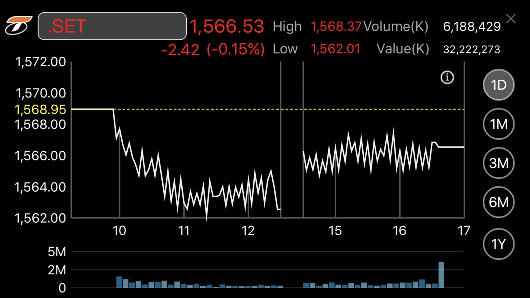 ผู้สื่อข่าวรายงานว่าดัชนีตลาดหลักทรัพย์ฯ ปิดวันนี้ที่ระดับ 1,566.53 จุด ลดลง 2.42 จุด หรือร้อยละ 0.15 มูลค่าการซื้อขาย 32,222.27 ล้านบาท โดยการซื้อขายหุ้นดัชนีเคลื่อนไหวแดนลบตลอดทั้งวัน แตะจุดสูงสุดที่ระดับ 1,568.37 จุด และต่ำสุดที่ระดับ 1,562.01 จุด