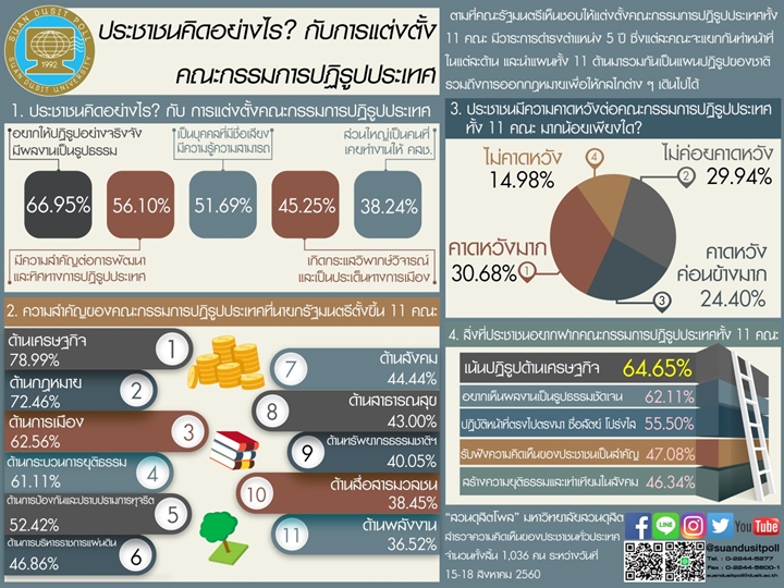 ตามที่คณะรัฐมนตรีเห็นชอบให้แต่งตั้งคณะกรรมการปฏิรูปประเทศทั้ง 11 คณะ มีวาระการดำรงตำแหน่ง 5 ปี ซึ่งแต่ละคณะจะแยกกันทำหน้าที่ในแต่ละด้าน และนำแผนทั้ง 11 ด้านมารวมกันเป็นแผนปฏิรูปของชาติ รวมถึงการออกกฎหมายเพื่อให้กลไกต่าง ๆ เดินไปได้ เพื่อสะท้อนความคิดเห็นของประชาชนต่อคณะกรรมการปฏิรูปประเทศ “สวนดุสิตโพล” มหาวิทยาลัยสวนดุสิต ได้สำรวจความคิดเห็นของประชาชนทั่วประเทศ จำนวนทั้งสิ้น 1,036 คน ระหว่างวันที่ 15-18 สิงหาคม 2560 ในหัวข้อ “ประชาชนคิดอย่างไร กับการแต่งตั้งคณะกรรมการปฏิรูปประเทศ” พบว่า อันดับ 1 ร้อยละ 66.95 อยากให้ปฏิรูปอย่างจริงจัง มีผลงานเป็นรูปธรรม อันดับ 2 ร้อยละ 56.10 มีความสำคัญต่อการพัฒนาและทิศทางการปฏิรูปประเทศ อันดับ 3 ร้อยละ 51.69 เป็นบุคคลที่มีชื่อเสียง มีความรู้ความสามารถ น่าจะทำงานได้ดี อันดับ 4 ร้อยละ 45.25 เกิดกระแสวิพากษ์วิจารณ์ และเป็นประเด็นทางการเมือง และอันดับ 5 ร้อยละ 38.24 ส่วนใหญ่เป็นคนที่เคยทำงานให้ คสช.ไม่ค่อยมีคนรุ่นใหม่