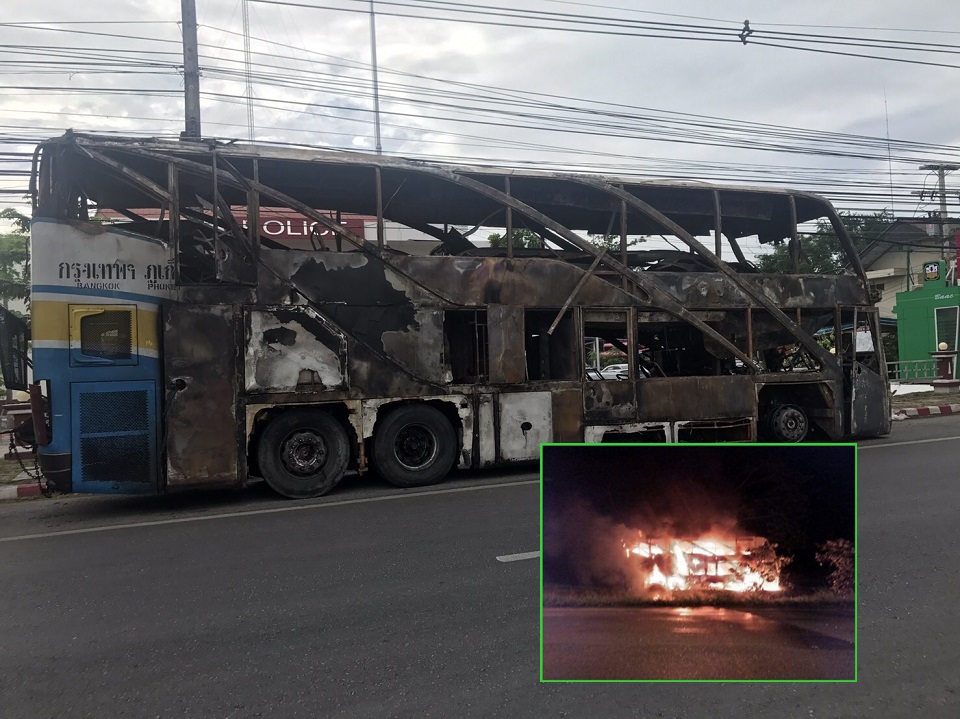 เบื้องต้นคนขับรถทัวร์ให้การว่า ขณะพาผู้โดยสารไปส่งปลายทางภูเก็ต เมื่อมาถึงบริเวณดังกล่าวมีรถจักรยานยนต์ขับตัดหน้าในระยะกระชั้นชิด จึงเบรคไม่ทันและชนลากไปไกลกว่า 50 เมตร จากนั้นก็เกิดเปลวเพลิงลุกไหม้ก่อนลามทั้งคัน และทรัพย์สินของผู้โดยสารเสียหายด้วย