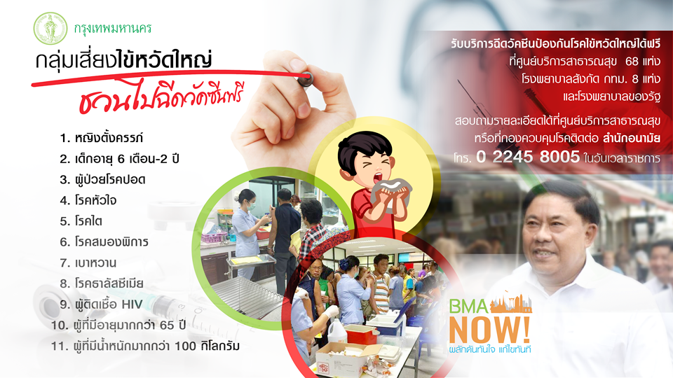 นายเมธิพจน์ กล่าวอีกว่า กทม.เปิดให้บริการฉีดวัคซีนป้องกันโรคไข้หวัดใหญ่ฟรี ที่ศูนย์บริการสาธารณสุข 68แห่ง รพ.ในสังกัด กทม.อีก 8แห่ง และรพ.ของรัฐ โดยเฉพาะกลุ่มเสี่ยง เช่น หญิงตั้งครรภ์ เด็กอายุ6เดือน -2ปี ผู้สูงอายุมากกว่า 65ปี กลุ่มโรคเรื้อรัง เช่น เบาหวาน โรคภูมิคุ้มกันต่ำ เช่น ผู้ติดเชื้อ HIV หากรู้สึกปวดศีรษะ ปวดเมื่อยตามร่างกายขั้นรุนแรงให้รีบพบแพทย์ ทั้งนี้ไข้หวัดใหญ่ที่พบช่วงนี้เป็นชนิดสายพันธ์เอ (H3N2) ซึ่งสายพันธ์นี้ หากฉีดวัคซีนจะสามารถป้องกันโรคได้ ร้อยละ30-40