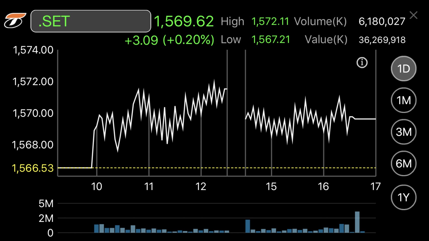 ผู้สื่อข่าวรายงานว่าดัชนีตลาดหลักทรัพย์ฯ ปิดวันนี้ที่ 1,569.62 จุด เพิ่มขึ้น 3.09 จุด หรือร้อยละ0.20 มูลค่าการซื้อขาย 36,269.92 ล้านบาท โดยการซื้อขายดัชนีเคลื่อนไหวแดนบวกตลอดทั้งวัน ดัชนีแตะจุดสูงสุดที่ระดับ 1,572.11 จุด และต่ำสุดที่ระดับ 1,567.21 จุด