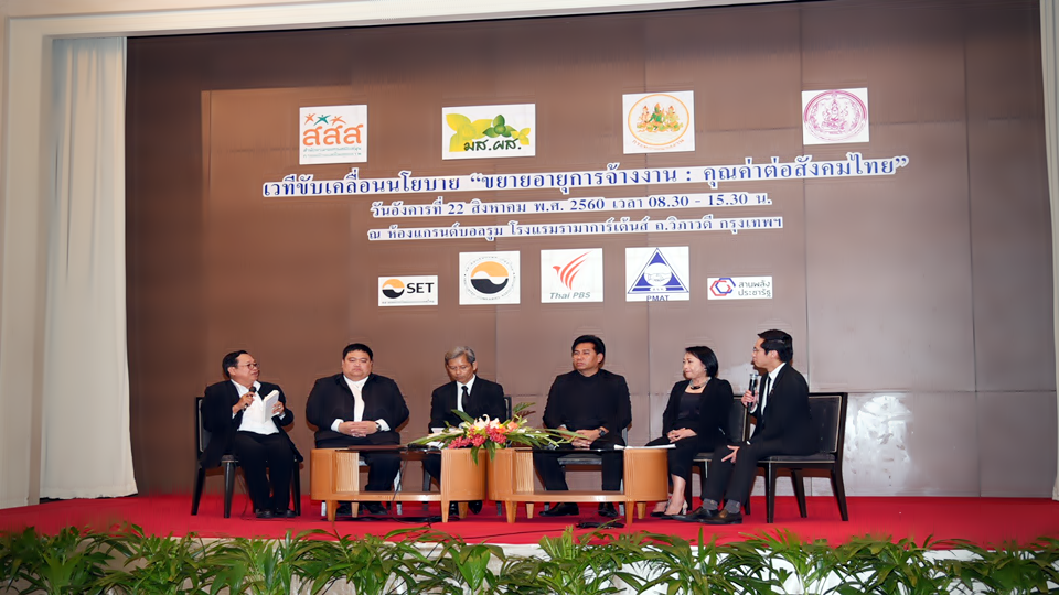 สำนักงานกองทุนสนับสนุนการสร้างเสริมสุขภาพ(สสส.)มูลนิธิสถาบันวิจัยและพัฒนาผู้สูงอายุไทย(มส.ผส.)และภาคีเครือข่าย จัดงานเวทีขับเคลื่อนนโยบาย “ขยายอายุการจ้างงาน : คุณค่าต่อสังคมไทย” โดยมี นพ.วิชัย โชควิวัฒน ประธานสมาคมสภาผู้สูงอายุแห่งประเทศไทยในพระราชูปถัมภ์ และรองประธานคณะกรรมการผู้สูงอายุแห่งชาติ คนที่ 2 เป็นประธานเปิดงาน ร่วมด้วยนพ.บรรลุ ศิริพานิช ประธานมูลนิธิสถาบันวิจัยและพัฒนาผู้สูงอายุไทย (มส.ผส.) ผู้แทนหน่วยงานภาครัฐ ผู้บริหารและสถานประกอบการโครงการนำร่อง 13 แห่ง