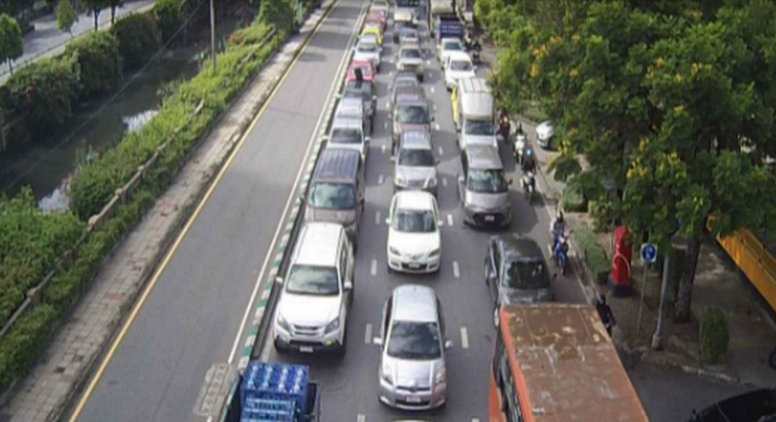 ถนนวิิภาวดี ขาเข้า มุ่งหน้าใต้ด่วนดินแดง รถหนาแน่น ท้ายชะลอตัวหน้าสถานีโทรทัศน์ NBT