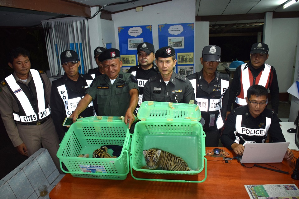เมื่อเวลา 00.15 น. (25 ส.ค.) ร.ต.อ.อิทธิกุล พินิจกุล หัวหน้าด้านตรวจปฐมพร สภ.เมืองชุมพร ตั้งด่านตรวจป้องกันปัญหาอาชญากรรมและความสงบเรียบร้อยบนถนนเพชรเกษม หมู่ 9 ตำบลวังไผ่ อ.เมือง ได้ตรวจสอบรถทัวร์ปรับอากาศ เกาะสมุย-กรุงเทพฯ ทะเบียน 15-5499 กรุงเทพมหานคร ขณะพาผู้โดยสารมาประมาณ 24 คน พบว่าคนขับรถทัวร์มีท่าทางพิรุธเมื่อเจ้าหน้าที่ขอตรวจสอบช่องเก็บสัมภาระผู้โดยสาร และพยายามบ่ายเบี่ยงไม่ยอมไขกุญแจ แต่สุดท้ายต้องทำตาม และพบตะกร้า 2 ใบ ใส่ลูกเสือโคร่งลายพาดกลอน เพศเมีย อายุประมาณ 2 เดือน ซึ่งเป็นสัตว์ป่าคุ้มครองตามกฎหมาย เจ้าหน้าที่ได้ยึดเป็นของกลางและคุมตัวคนขับ คือ นายสมนึก ใจมั่น อายุ 58 ปี มาสอบปากคำก่อนดำเนินคดี พร้อมประสานนายนิสิทธิ์ ยมศิริ หัวหน้าด่านตรวจสัตว์ป่าชุมพร และเจ้าหน้าที่ตำรวจ ปทส.ประจำจังหวัดชุมพร มาร่วมตรวจสอบ