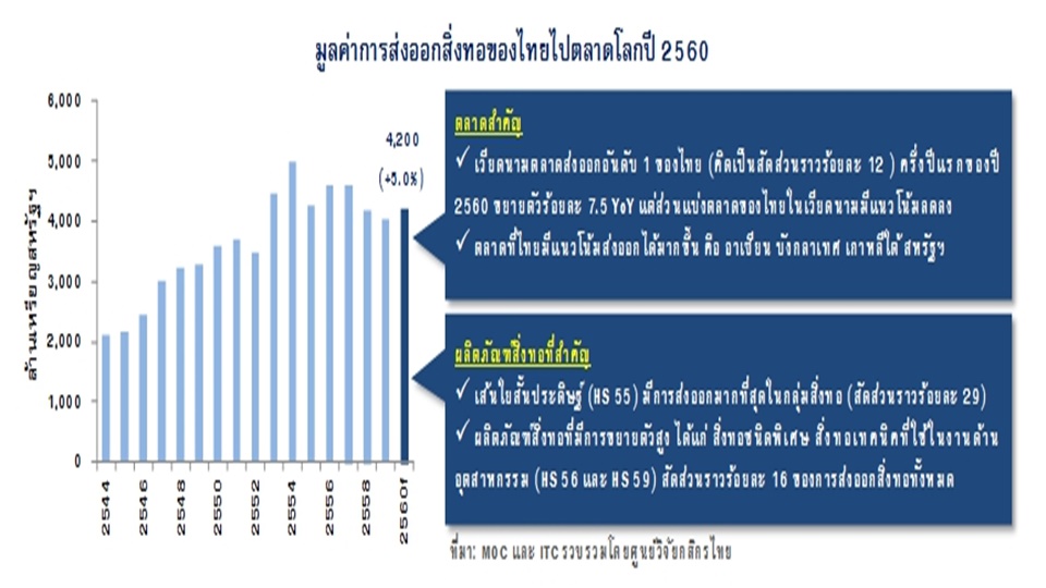บริษัท ศูนย์วิจัยกสิกรไทย จำกัด ระบุว่า ปี 2560 ไทยจะสามารถส่งออกสิ่งทอ (ไม่รวมเครื่องนุ่งห่ม) ไปตลาดโลกไม่ต่ำกว่า 4,200 ล้านดอลลาร์สหรัฐ ขยายตัวร้อยละ 5.0 และปี 2561 คาดว่าน่าจะยังคงรักษาการเติบโตใกล้เคียงกับปีนี้ที่ร้อยละ 3.0-7.0 ทั้งนี้ เวียดนามเป็นตลาดส่งออกอันดับ 1 ของไทย และตลาดที่มีแนวโน้มส่งออกมากขึ้น ได้แก่ อาเซียน บังกลาเทศ เกาหลีใต้ สหรัฐ ส่วนผลิตภัณฑ์สิ่งทอที่มีการขยายตัวสูง ได้แก่ สิ่งทอชนิดพิเศษ สิ่งทอเทคนิคที่ใช้ในงานด้านอุตสาหกรรม มีสัดส่วนร้อยละ 16 ของการส่งออกสิ่งทอทั้งหมด