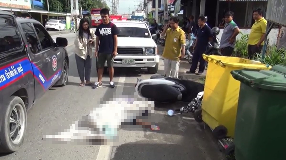 ชลบุรี 26 ส.ค.-สาวโรงงานขี่รถจักรยานยนต์จะกลับบ้าน ถูกรถบัสรับส่งพนักงานทับศีรษะเสียชีวิตคาที่ คนขับรถบัสอ้างผู้ตายขี่รถ จยย.แซงซ้ายก่อนเฉี่ยวชนถังขยะ แล้วล้มไถลเข้าใต้ท้องรถบัสเอง