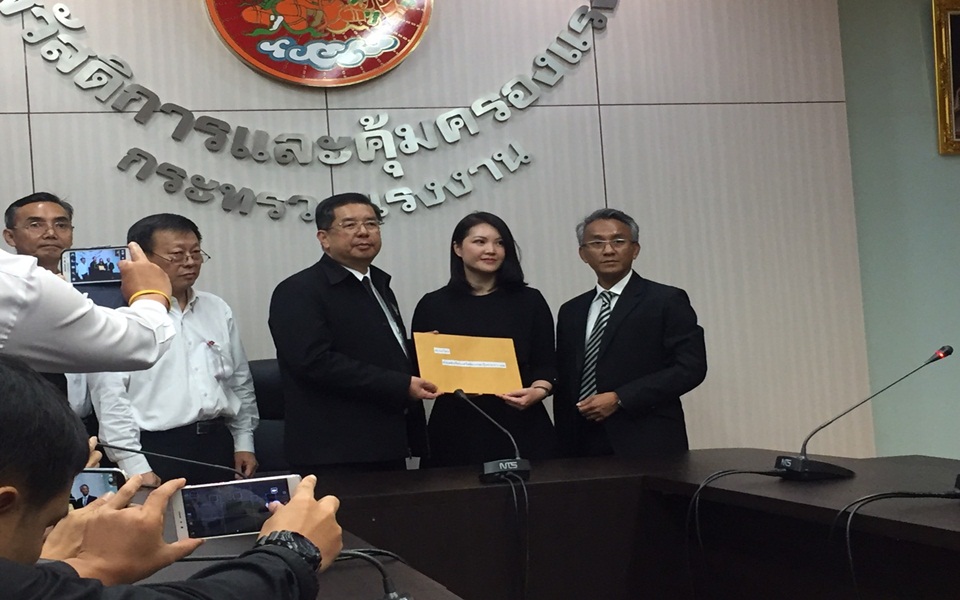 นางสุธิดา สังขพงศ์ อดีตพนักงานต้อนรับบนเครื่องบิน บริษัท การบินไทย จำกัด (มหาชน) พร้อมนายปริญ เกษะศิริ ทนายความ เข้ายื่นหนังสือต่อกระทรวงแรงงาน เพื่อขอความเป็นธรรมหลังถูกนายจ้างเลิกจ้างโดยไม่เป็นธรรม