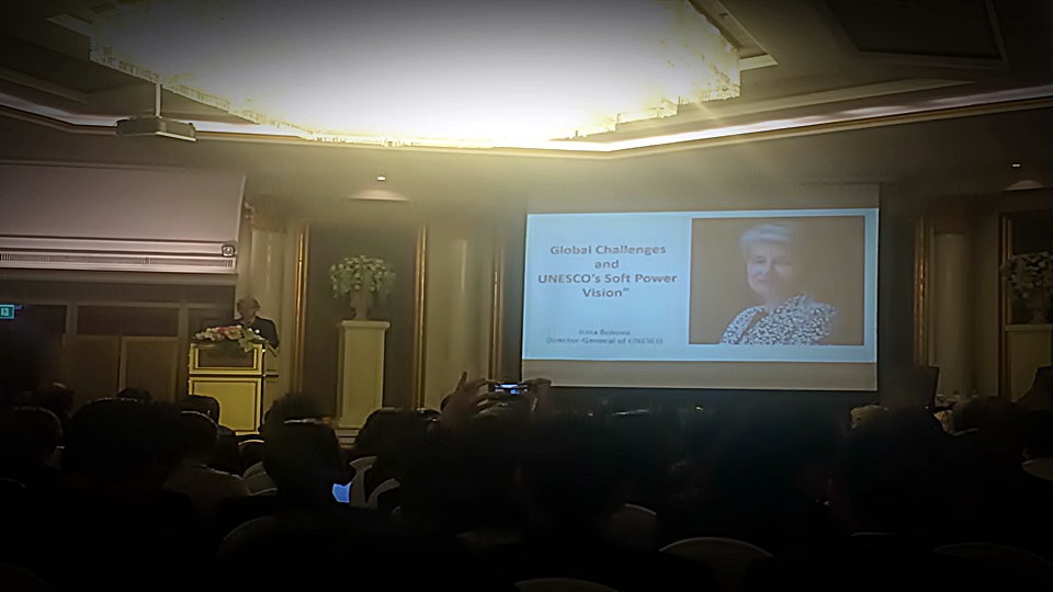 นางอีริน่า กล่าวว่า ปัจจุบันองค์การยูเนสโกได้พยายามสนับสนุนประเทศต่างๆให้มีเเนวทางพัฒนาประเทศ ซึ่งการพัฒนาต้องควบคู่กับจริยธรรม นั่นคือการใช้ soft power คืออำนาจในการโน้มน้าวจูงใจ โดยใช้การศึกษา วิทยาศาสตร์ สังคมศาสตร์เเละวัฒนธรรม เพื่อการเรียนรู้ ตอบสนองความต้องการของยุคโลกาภิวัฒน์ ซึ่งสำหรับประเทศไทย ก็มีการใช้soft powerในรูปแบบหนึ่ง ในเเนวคิดปรัชญาเศรษฐกิจพอเพียง ของพระบาทสมเด็จพระปรมินทรมหาภูมิพลอดุลยเดช ที่ทรงดำเนินการด้านการศึกษาเเละพัฒนาทรัพยากรมนุษย์อย่างต่อเนื่อง ซึ่งเเนวคิดปรัชญาเศรษฐกิจพอเพียงนั้นคือการนำศาสตร์ด้านต่างๆ มารวมกัน จนเกิดเป็นนวัตกรรมใหม่ที่นำไปสู่การพัฒนาอย่างยั่งยืน ช่วยเหลือประชาชนทุกคนได้ ทำให้เเนวคิดนี้ยังใช้ได้ในทุกยุคทุกสมัยเเม้ว่าโลกจะเปลี่ยนเเปลงไปก็ตาม