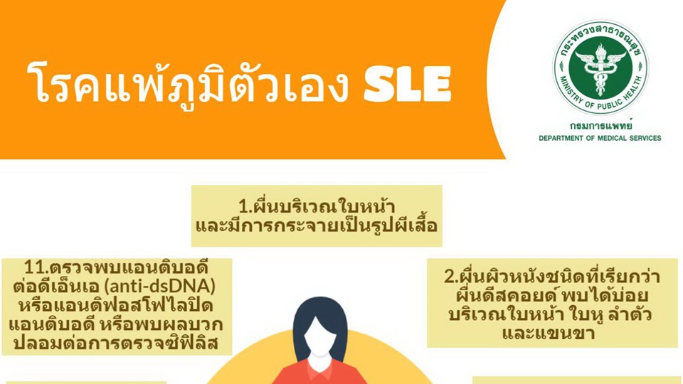 กรมการแพทย์ 29 ส.ค.-แพทย์ชี้โรค SLE ทำให้เกิดการอักเสบเรื้อรัง ของอวัยวะต่างๆ โดยมีความผิดพลาดในระบบภูมิคุ้มกันของผู้ป่วยเอง ทำให้เซลล์ปกติของตัวเองบาดเจ็บ อาการของโรคจะเป็นๆ หายๆ มีการกำเริบและสงบเป็นระยะ พบได้บ่อยในหญิงมากกว่าชาย หากพบความผิดปกติ 4 ใน 11 ข้อ ควรเข้ารับการรักษาอย่างถูกต้อง