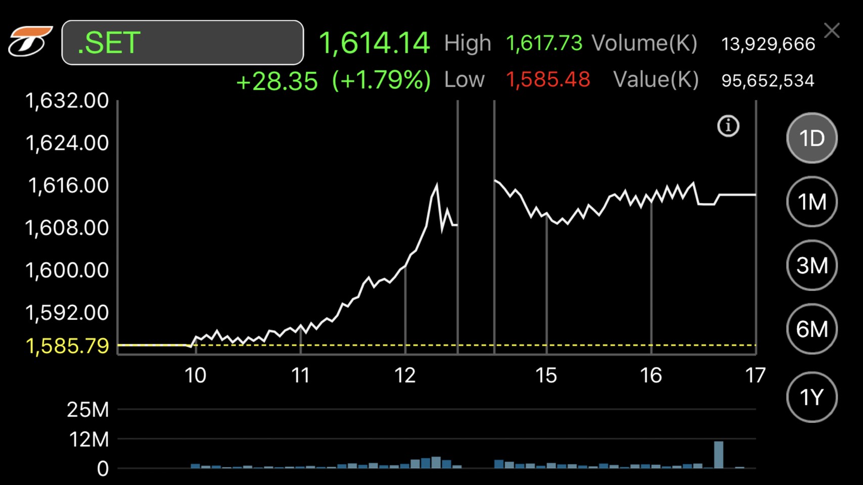 ผู้สื่อข่าวรายงานว่าดัชนีตลาดหลักทรัพย์ฯ ปิดการซื้อขายวันนี้ที่ระดับ 1,614.14 จุด เพิ่มขึ้น 28.35 จุด หรือคิดเป็นร้อยละ 1.79 มูลค่าการซื้อขายหนาแน่น 95,652.53 ล้านบาท ตลาดหุ้นไทยปรับขึ้นร้อนแรง แรงซื้อหุ้นขนาดใหญ่ สวนทิศทางตลาดหุ้นภูมิภาค โดยระหว่างวันดัชนีทำระดับสูงสุดในรอบ 1 ปี 6 เดือน ที่ระดับ 1,617.73 จุด