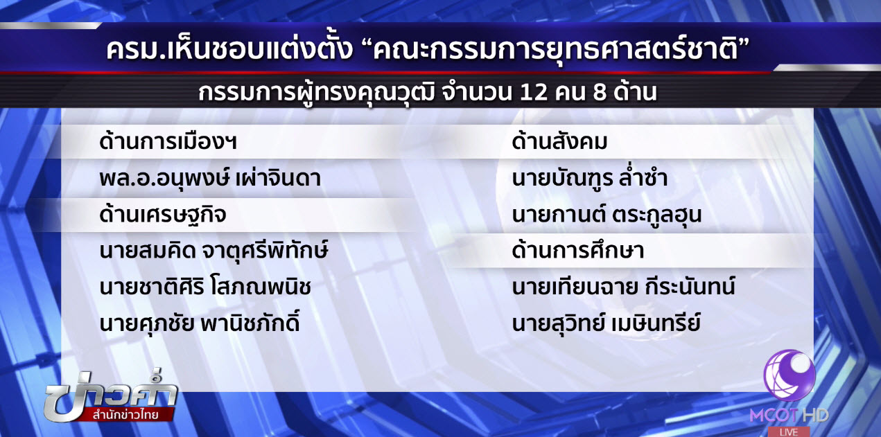 โดยกรรมการยุทธศาสตร์ชาติมีนายกรัฐมนตรีเป็นประธาน พล.อ.ประวิตร วงษ์สุวรรณ รองนายกรัฐมนตรีฝ่ายความมั่นคง และรัฐมนตรีว่าการกระทรวงกลาโหม เป็นรองประธานคณะกรรมการยุทธศาสตร์ชาติ ส่วนผู้ทรงคุณวุฒิด้านต่างๆ มี 12 คน อาทิ นายกานต์ ตระกูลฮุน, นายชาติศิริ โสภณพนิช, นายเทียนฉาย กีระนันทน์, นายบัณฑูร ล่ำซำ, พล.อ.อ.ประจิน จั่นตอง, นายพลเดช ปิ่นประทีป, นายวิษณุ เครืองาม, นายสมคิด จาตุศรีพิทักษ์, นายศุภชัย พานิชภักดิ์, นายสุวิทย์ เมษินทรีย์, พล.อ.อนุพงษ์ เผ่าจินดา และนายอุตตม สาวนายน โดยในวันพรุ่งนี้จะมีการประชุมคณะกรรมการปฏิรูปประเทศทั้ง 11 ด้าน เพื่อชี้แจงแผนการดำเนินงาน งบประมาณ ค่าตอบแทน รวมถึงแนวทางการทำงานกฎกติกาต่างๆ ตามที่คณะกรรมการยุทธศาสตร์ชาติมอบหมาย