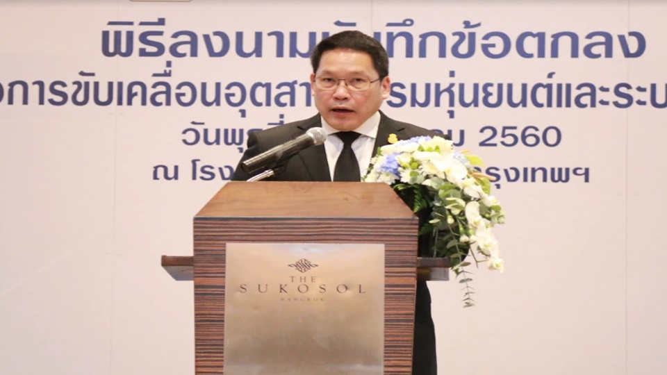 กระทรวงอุตสาหกรรมลงนามบันทึกข้อตกลงความร่วมมือขับเคลื่อนอุตสาหกรรมหุ่นยนต์และระบบอัตโนมัติในแนวทางประชารัฐร่วมกับหน่วยงานภาครัฐและเอกชนรวม 14 หน่วยงาน เพื่อปรับปรุงประสิทธิภาพการผลิตและเพิ่มขีดความสามารถในการแข่งขันของภาคอุตสาหกรรมไทยมุ่งสู่ประเทศไทย 4.0 นายอุตตม สาวนายน รัฐมนตรีว่าการกระทรวงอุตสาหกรรม เปิดเผยว่า กระทรวงอุตสาหกรรมเล็งเห็นความจำเป็นเร่งด่วนในการสร้างความแข็งแกร่งให้กับอุตสาหกรรมหุ่นยนต์และระบบอัตโนมัติในฐานะอุตสาหกรรมแห่งอนาคตและสนับสนุนการเติบโตของอุตสาหกรรมเป้าหมายอื่น ๆ จึงวางโรดแมพการพัฒนาอุตสาหกรรมในแนวประชารัฐ โดยมีองค์ประกอบ 3 ส่วนหลัก คือ 1.การกระตุ้นอุปสงค์ โดยสนับสนุนให้อุตสาหกรรมการผลิตและบริการภายในประเทศ นำหุ่นยนต์และระบบอัตโนมัติมาใช้เพื่อปรับปรุงประสิทธิภาพ ซึ่งจะกระตุ้นให้เกิดการลงทุนผลิตอุตสาหกรรมหุ่นยนต์และระบบอัตโนมัติ โดยคาดว่าจะทำให้เกิดการลงทุนใช้หุ่นยนต์ 12,000 ล้านบาทในปีแรก และมีการขยายการลงทุนกว่า 200,000 ล้านบาทใน 5 ปี