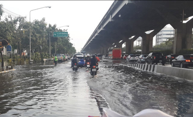 สภาพการจราจร ถนนพหลโยธิน จาก ตลาดยิ่งเจริญ มุ่งหน้า ซอยสายหยุด รถหนาแน่นติดขัดทั้ง 2 ฝั่ง เนื่องจากช่วงซอยพหลโยธิน 48 มีน้ำท่วมขังผิวจราจร
