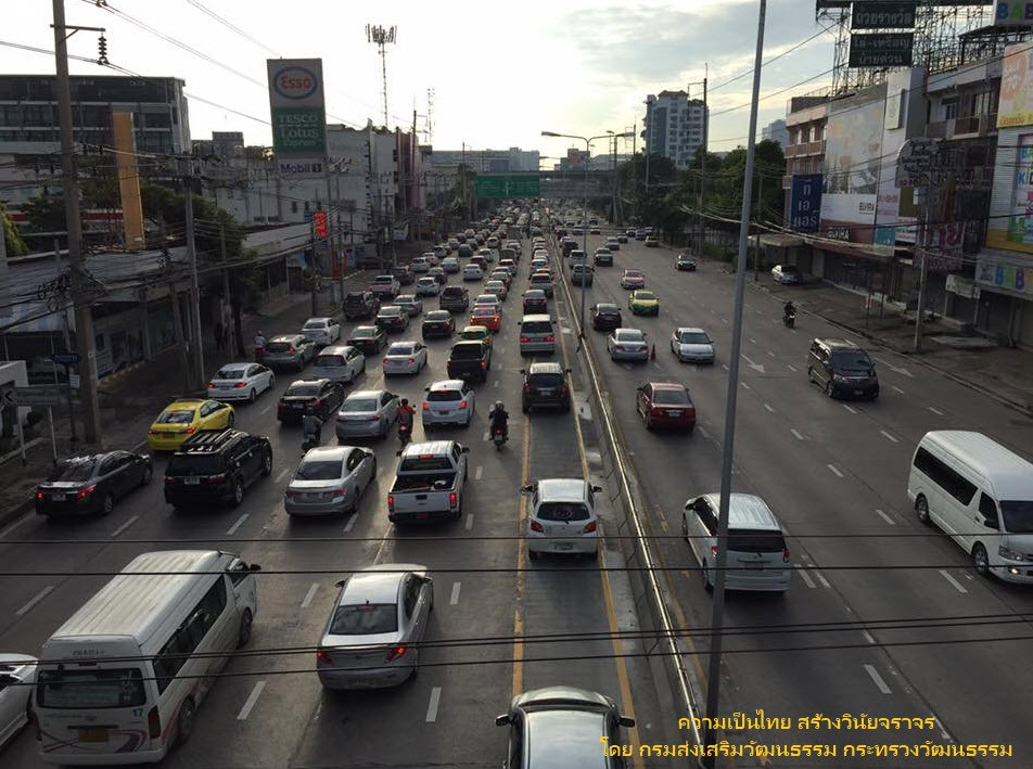 การจราจรหนาแน่นบนถนนสุขุมวิท ขาเข้า จากบางจาก มุ่งหน้าแยกอ่อนนุช รถเคลื่อนตัวช้า ตามจังหวะสัญญาณไฟที่แยกอ่อนนุช