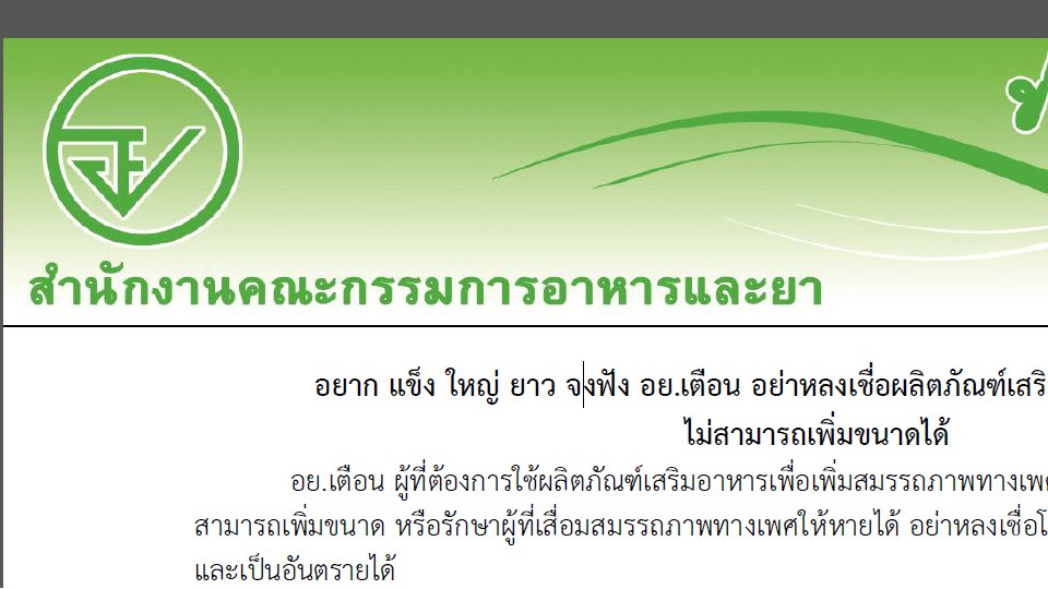 อย.31 ส.ค.-อย.เตือน ผู้ที่ต้องการใช้ผลิตภัณฑ์เสริมอาหารเพื่อเพิ่มสมรรถภาพทางเพศ ไม่มีผลิตภัณฑ์เสริมอาหารชนิดไหนสามารถเพิ่มขนาด หรือรักษาผู้เสื่อมสมรรถภาพทางเพศให้หายได้ อย่าหลงเชื่อโฆษณาโอ้อวดเกินจริง อาจสูญเสียเงิน และเป็นอันตรายได้