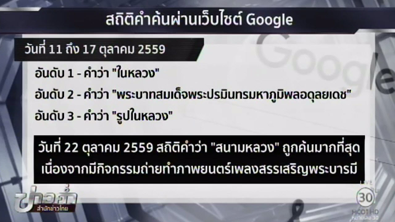พร้อมกันนี้ ในหน้าเว็บค้นหาของ google.co.th ยังแสดงความอาลัยด้วยการปรากฏโลโก้ “google” สีดำติดพร้อมริบบิ้นสีดำ โดยในรอบสัปดาห์ที่ผ่านมาตั้งแต่วันที่ 11 – 17 ต.ค.ที่ผ่านมา ข้อมูลจากกูเกิล เทรนด์ พบคำค้นหาในกูเกิลอันดับ 1 คือ คำว่า “ในหลวง” อันดับ 2 คือคำว่า “พระบาทสมเด็จพระปรมินทรมหาภูมิพลอดุลยเดช” และอันดับ 3 คือ คำว่า “รูปในหลวง” อีกทั้งเฉพาะวันที่ 22 ต.ค.ที่ผ่านมา สถิติคำว่า “สนามหลวง” เป็นคำที่ถูกค้นหามากที่สุด เนื่องจากเป็นวันที่มีกิจกรรมถ่ายทำภาพยนตร์เพลงสรรเสริญพระบารมี ซึ่งประชาชนพร้อมใจเดินทางเข้าร่วมกิจกรรมเป็นจำนวนมากนั่นเอง.-สำนักข่าวไทย