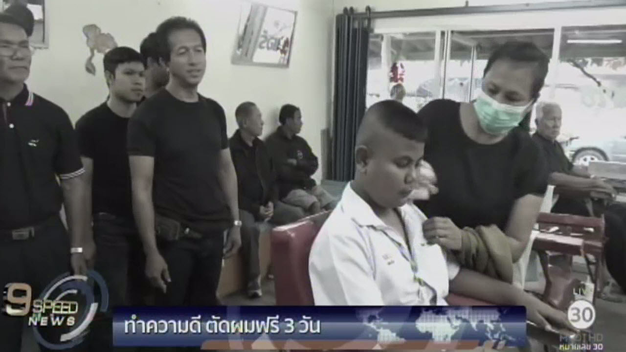 ตรัง 24 ต.ค.-ช่างผมกว่า 10 คน ของชมรมช่างตัดผม อ.นาโยง จ.ตรัง กราบพระบรมฉายาลักษณ์ พระบาทสมเด็จพระปรมินทรมหาภูมิพลอดุลยเดช ก่อนเริ่มให้บริการตัดผมฟรี 3 วัน ตั้งแต่วันนี้ – 26 ตุลาคมนี้ เพื่อร่วมทำความดีถวายเป็นพระราชกุศล มีประชาชน นักเรียน นักศึกษาเข้ามาใช้บริการเป็นจำนวนมาก บางคนซื้อขนม น้ำดื่มและผลไม้ มาตอบแทนน้ำใจช่างตัดผมด้วย นายโกศล โพชสาลี ประธานชมรม บอกว่าตั้งใจทำความดีเท่าที่มีกำลังความสามารถ โดยรู้สึกสุขใจและภูมิใจมาก ที่ได้ลงมือทำความดีในครั้งนี้.-สำนักข่าวไทย