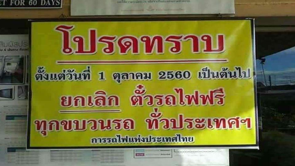นายอานนท์ เหลืองบริบูรณ์ ผู้ตรวจราชการกระทรวงคมนาคม รักษาการผู้ว่าการการรถไฟแห่งประเทศไทย (รฟท.) ชี้แจงประเด็นแฟนเพจอาณาจักรไบกอน Returns เผยแพร่รูปภาพระบุข้อความว่า “โปรดทราบตั้งแต่วันที่ 1 ตุลาคม 2560 เป็นต้นไป ยกเลิกตั๋วรถไฟฟรีทุกขบวนรถทั่วประเทศ โดยการรถไฟแห่งประเทศไทย” ว่า ตามที่รัฐบาลเริ่มดำเนินมาตรการลดภาระค่าครองชีพของประชาชน เพื่อบรรเทาความเดือดร้อนจากปัญหาเศรษฐกิจตั้งแต่ปี 2551 และขยายเวลาเป็นระยะๆ จนถึงวันที่ 30 กันยายน 2560 การดำเนินการดังกล่าวแม้จะเป็นประโยชน์กับประชาชนในวงกว้าง แต่เป็นการช่วยเหลือบุคคลที่ไม่ตรงกับกลุ่มเป้าหมายผู้มีรายได้น้อยอย่างแท้จริง คือ บุคคลสัญชาติไทยและต่างด้าวทุกคนสามารถใช้บริการรถเมล์และรถไฟฟรีได้อย่างไม่มีข้อจำกัด ดังนั้น เพื่อให้เกิดประโยชน์ต่อประชาชนผู้มีรายได้น้อยอย่างแท้จริงและทั่วถึง ครม.มีมติเมื่อวันที่ 29 สิงหาคม 2560 เห็นชอบในหลักการแนวทางการจัดประชารัฐสวัสดิการ การให้ความช่วยเหลือผ่านบัตรสวัสดิการแห่งรัฐ ตามที่กระทรวงการคลังเสนอ โดยจะให้ความช่วยเหลือผู้ที่ลงทะเบียนรายได้น้อยและผ่านการตรวจสอบคุณสมบัติ 11.67 ล้านราย ผ่านบัตรสวัสดิการแห่งรัฐ เพื่อช่วยลดค่าใช้จ่ายในครัวเรือน โดยบัตรสวัสดิการแห่งรัฐจะแบ่งเป็น 2 ส่วนคือ