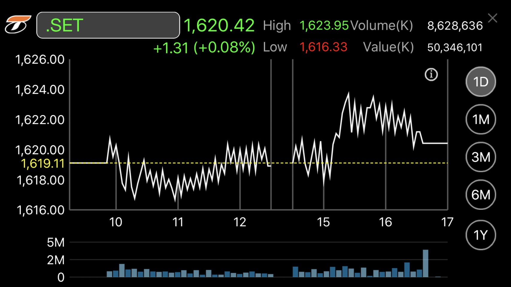 ผู้สื่อข่าวรายงานว่าดัชนีตลาดหลักทรัพย์ฯ ปิดวันนี้ที่ระดับ 1,620.42 จุด เพิ่มขึ้น 1.31 จุด (+0.08%) มูลค่าการซื้อขาย 50,346.10 ล้านบาท โดยการซื้อขายดัชนีเคลื่อนไหวแดนบวกและลบ แตะจุดสูงสุดที่ 1,623.95 จุด และต่ำสุดที่ระดับ 1,616.33 จุด