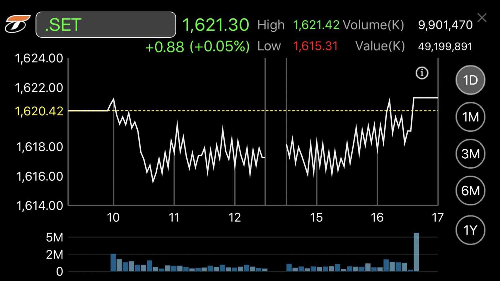 1,621.30 จุด เพิ่มขึ้น 0.88 จุด หรือร้อยละ 0.05 มูลค่าการซื้อขาย 49,199.98