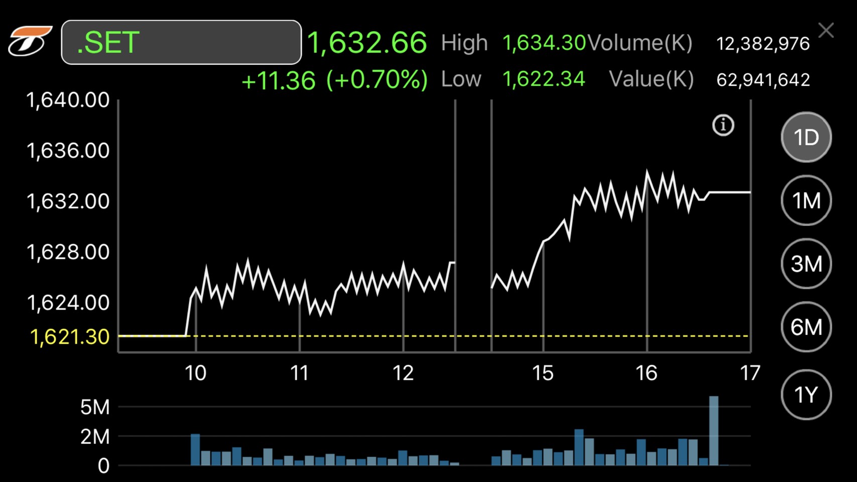 ผู้สื่อข่าวรายงานว่าดัชนีตลาดหลักทรัพย์ฯ ปิดวันนี้ (7 ก.ย.) ที่ระดับ 1,632.66 จุด เพิ่มขึ้น 11.36 จุด หรือร้อยละ0.70 มูลค่าการซื้อขาย 62,941.64 ล้านบาท โดยการซื้อขายหุ้นดัชนีเคลื่อนไหวแดนบวก แตะจุดสูงสุดที่ 1,634.30 จุด และต่ำสุดที่ระดับ 1,622.34 จุด