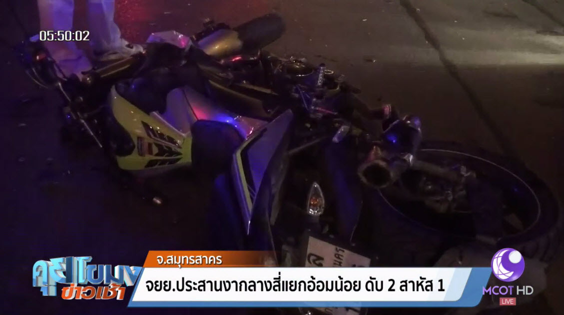 สมุทรสาคร 8 ก.ย. – เมื่อเวลาประมาณ 01.30 น. ที่ผ่านมา สารวัตรสอบสวน สภ.กระทุ่มแบน จ.สมุทรสาคร ได้รับแจ้งมีอุบัติเหตุรถจักรยานยนต์ชนประสานงากันตรงสี่แยกอ้อมน้อย ต.อ้อมน้อย จึงไปตรวจสอบพร้อมเจ้าหน้าที่ร่วมกตัญญู ที่เกิดเหตุพบศพชาย 2 คน นอนหงายจมกองเลือด ศพแรกนอนอยู่ใกล้กับริมถนน สภาพศีรษะแตก ร่างกายมีบาดแผลหลายแห่ง ทราบชื่อนายอนุพันธ์ ชูตระกูลธรรม อายุ 35 ปี ชาวหนองแขม ตรวจค้นภายในตัวมีเงินสดกว่า 10,000 บาท และสร้อยคอทองคำ 1 เส้น ห่างไปประมาณ 3 เมตร พบรถจักรยานยนต์แบบผู้ชาย สีเหลืองดำ หมายเลขทะเบียน กรุงเทพมหานคร ล้มคว่ำอยู่ในสภาพด้านหน้าถูกชนจนพังยับ