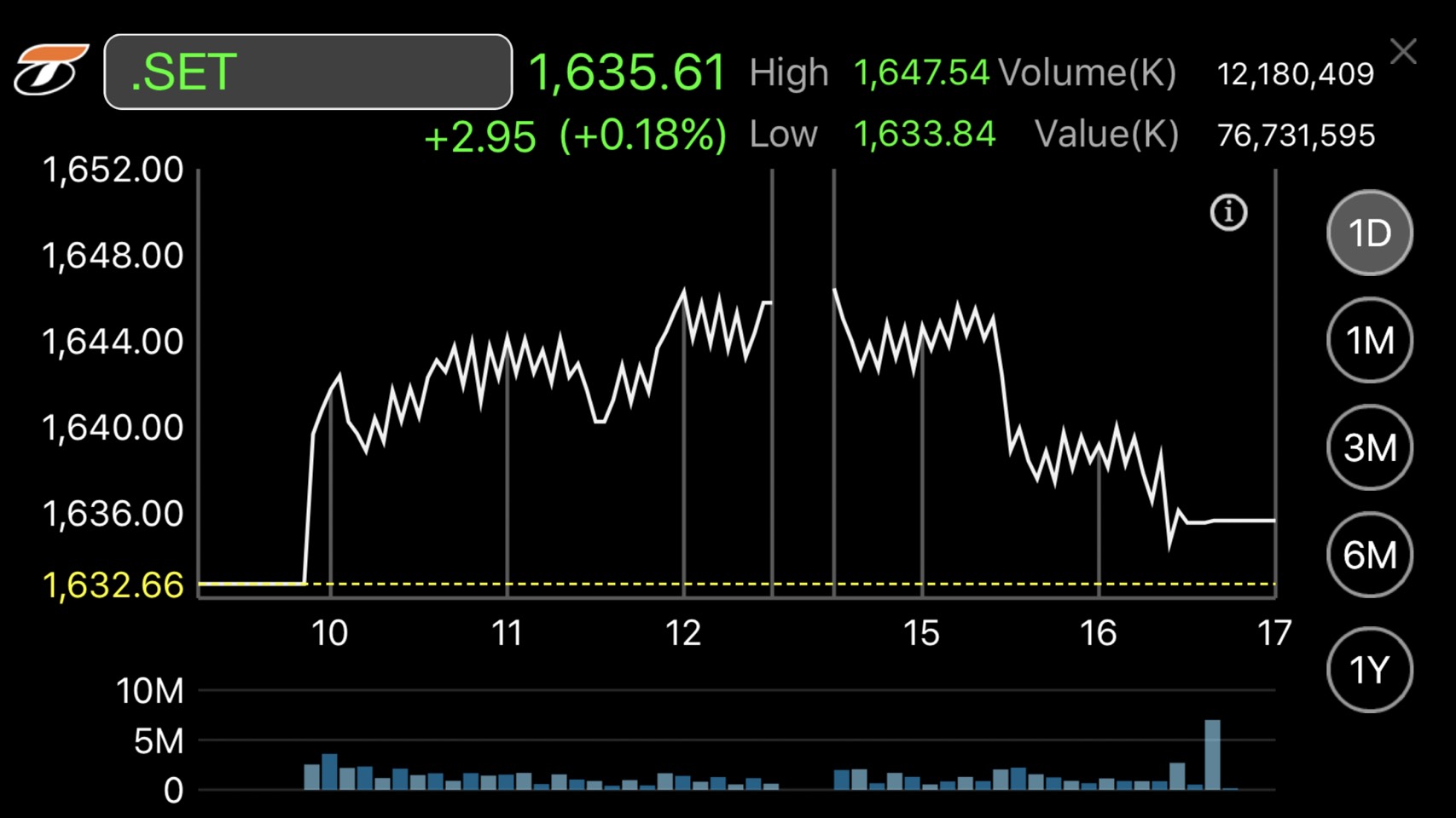 ผู้สื่อข่าวรายงานว่าดัชนีหุ้นไทยปิดการซื้อขายวันนี้ (8 ก.ย.) ที่ระดับ 1,635.61 จุด เพิ่มขึ้น 2.95 จุด หรือ ร้อยละ 0.18 มูลค่าการซื้อขาย 76,731.59 ล้านบาท หุ้นไทยเคลื่อนไหวแกว่งตัวส่วนใหญ่แดนบวก โดยยังมีเงินทุนไหลเข้าต่อเนื่องในหุ้นขนาดใหญ่ หนุนดัชนีหุ้นไทย ขึ้นไปสูงสุดของวันที่ระดับ 1,647.54 และต่ำสุดที่ระดับ 1,633.84 จุด