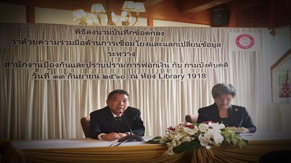 พล.ต.อ.ชัยยะ ศิริอำพันธ์กุล เลขาธิการคณะกรรมการป้องกันและปราบ ปรามการฟอกเงิน (ปปง.) พร้อมด้วย น.ส.รื่นวดี สุวรรณมงคล อธิบดีกรมบังคับคดี ร่วมลงนามบันทึกข้อตกลงว่าด้วยความร่วมร่วมมือด้านการเชื่อมโยงและแลกเปลี่ยนข้อมูลในคดีระหว่าง ปปง.และกรมบังคับคดี จากแผนยุทธศาสตร์ 5 ปี(พ.ศ.2560-2564) และแผนปฏิบัติราชการ 4 ปี(พ.ศ.2560-2563) ของ ปปง.ในด้านการบังคับใช้กฎหมายให้สอดคล้องกับความเสี่ยงด้านการป้องกันดูแลปราบปรามการฟอกเงินและต่อต้านการสนับสนุนการก่อการร้าย ให้มีประสิทธิภาพ ประสิทธิผลและให้เกิดความรวดเร็วมากยิ่งขึ้น