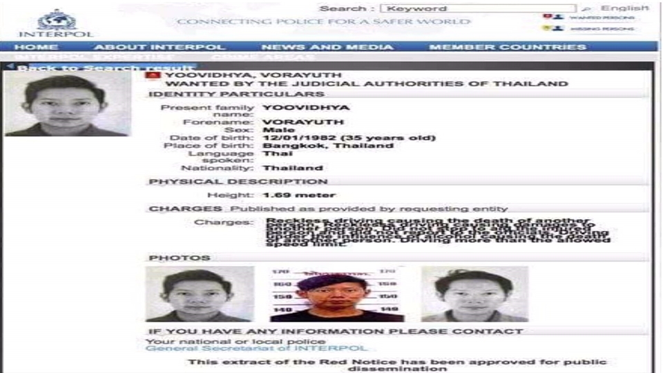 นายอำนาจ โชติชัย อธิบดีอัยการสำนักงานต่างประเทศ เปิดเผยถึงขั้นตอนปฏิบัติหากพบตัวนายวรยุทธ หรือบอส อยู่วิทยา อายุ 31 ปีทายาทเครื่องดื่มชูกำลัง ผู้ต้องหาขับรถประมาทชนดาบตำรวจ สน.ทองหล่อ เสียชีวิต ปี 2555 ว่า เมื่อตำรวจสากล ได้ออกหมายจับส่งเผยแพร่ไปยังประเทศสมาชิกกว่า 100 ประเทศแล้ว หากพบเห็นผู้ต้องหาในประเทศใด ตำรวจสากลสามารถจับกุมตัวตามหมายจับได้ ก่อนควบคุมตัวไว้ชั่วคราวตามระยะเวลาที่กฎหมายประเทศนั้นๆจากนั้นตำรวจสากลก็จะแจ้งข้อมูลการจับกุม พิกัดที่อยู่นั้นให้ตำรวจไทยทราบเพื่อให้ดำเนินการตามขั้นตอนของกฎหมายขอส่งผู้ร้ายข้ามแดน และเมื่อตำรวจไทยได้รับทราบข้อมูลกับที่อยู่แล้วก็จะแจ้งให้สำนักงานอัยการสูงสุด ดำเนินตามขั้นตอน พ.ร.บ.ส่งผู้ร้ายข้ามแดน พ.ศ.2551