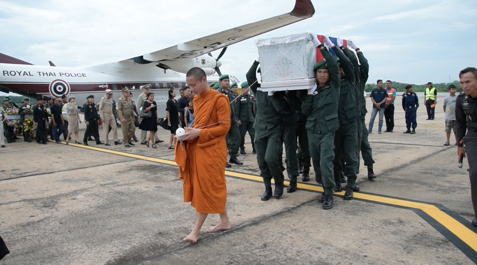 ภูมิภาค 15 ก.ย.- ศพตำรวจและทหารพิทักษ์ความปลอดภัยชายแดนใต้เคลื่อนย้ายถึงภูมิลำเนาแล้ว ท่ามกลางชุดกองเกียรติยศรับอย่างสมเกียรติ โดยศพ “ด.ต.อนิรุทธ” ตั้งบำเพ็ญกุศลที่จังหวัดเลย และ “ส.ต.ธเนตร” ตั้งบำเพ็ญกุศลที่นครสวรรค์