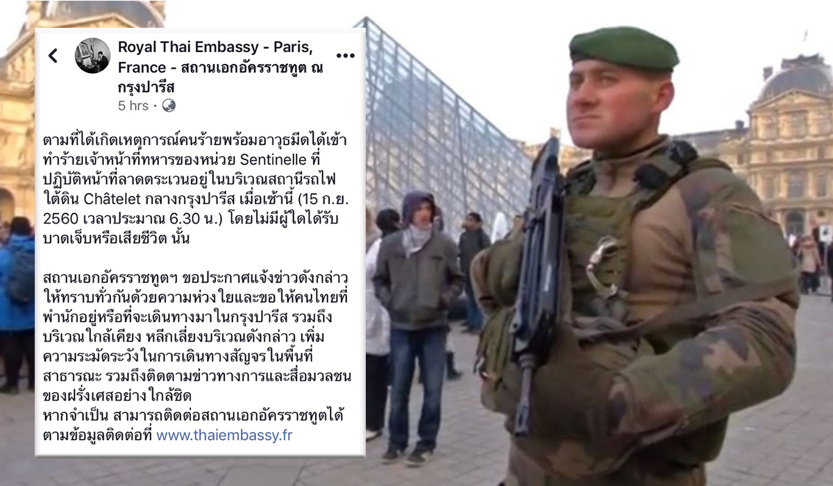 ผู้สื่อข่าวรายงานว่า เว็บไซต์เฟซบุ๊กสถานเอกอัครราชทูตไทย ณ กรุงปารีส ประเทศฝรั่งเศส แจ้งว่า ตามที่เกิดเหตุการณ์คนร้ายพร้อมอาวุธมีดได้เข้าทำร้ายเจ้าหน้าที่ทหารของหน่วย Sentinelle ที่ปฏิบัติหน้าที่ลาดตระเวนอยู่ในบริเวณสถานีรถไฟใต้ดิน Châtelet กลางกรุงปารีส เมื่อเวลาประมาณ 06.30 น.ของเช้าวันที่ 15 ก.ย.ที่ผ่านมา ตามเวลาของฝรั่งเศส โดยไม่มีผู้ใดได้รับบาดเจ็บหรือเสียชีวิตนั้น สถานเอกอัครราชทูตไทยฯ ขอแจ้งให้คนไทยที่พำนักอยู่หรือที่จะเดินทางมาในกรุงปารีสและบริเวณใกล้เคียง อีกทั้งหลีกเลี่ยงบริเวณดังกล่าว เพิ่มความระมัดระวังในการเดินทางสัญจรในพื้นที่สาธารณะ รวมถึงติดตามข่าวทางการและสื่อมวลชนของฝรั่งเศสอย่างใกล้ชิด หากจำเป็น สามารถติดต่อสถานเอกอัครราชทูตไทยฯ ได้ตามข้อมูลติดต่อที่เว็บไซต์สถานเอกอัครราชทูตไทยฯ www.thaiembassy.fr.-สำนักข่าวไทย