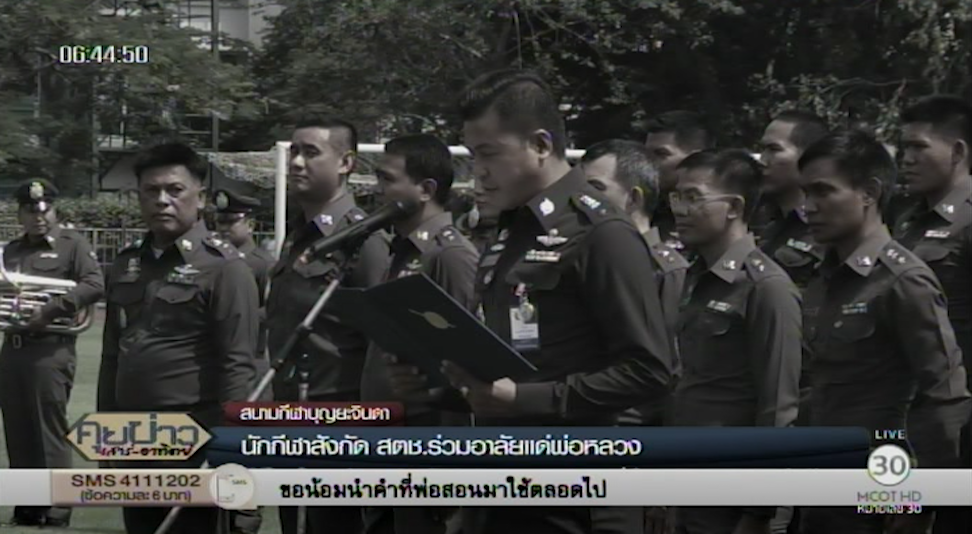 พ.ต.อ.อารยะพันธุ์ พุกบัวขาว รองผู้บังคับการ กองสวัสดิการ สำนักงานกำลังพล สำนักงานตำรวจแห่งชาติ พร้อมด้วยนักกีฬาทีมชาติไทยในสังกัดสำนักงานตำรวจแห่งชาติ จำนวน 12 ชนิดกีฬา และเจ้าหน้าที่ตำรวจหน่วยควบคุมฝูงชน รวม 200 นาย นำโดย ชนาธิป สรงกระสินธ์, ธีราทร บุญมาทัน , ธนา ชะนะบุตร, นฤบดินทร์ วีรวัฒโนดม, ปกเกล้า อนันต์ 4 นักเตะทีมชาติไทย, สัพพัญญู อวิหิงสานนท์ นักกีฬาแบดมินตัน, อภิสิทธิ์ พรมแก้ว นักกรีฑา, ภาคภูมิ สงวนสิน นักกีฬาเทเบิ้ลเทนนิส และเทวฤทธิ์ มัจฉาชีพ นักกีฬายิงปืน ได้ร่วมถวายความอาลัยต่อพระบาทสมเด็จพระปรมินทรมหาภูมิพลอดุลยเดช ด้วยการยืนสงบนิ่งเป็นเวลา 9 นาที และร่วมร้องเพลงสรรเสริญพระบารมี ก่อนร่วมลงนามถวายความอาลัยต่อหน้าพระบรมฉายาลักษณ์ ณ สนามกีฬาบุญยะจินดา ซึ่งภายหลังจบพิธีนักกีฬาทีมชาติไทยทุกคนต่างร่วมปฎิญาณจะเป็นนักกีฬาที่ทำชื่อเสียงให้กับประเทศชาติ และข้าราชการตำรวจที่ดีของแผ่นดินตลอดไป เพื่อเป็นการตอบแทนพระคุณของแผ่นดิน.-สำนักข่าวไทย