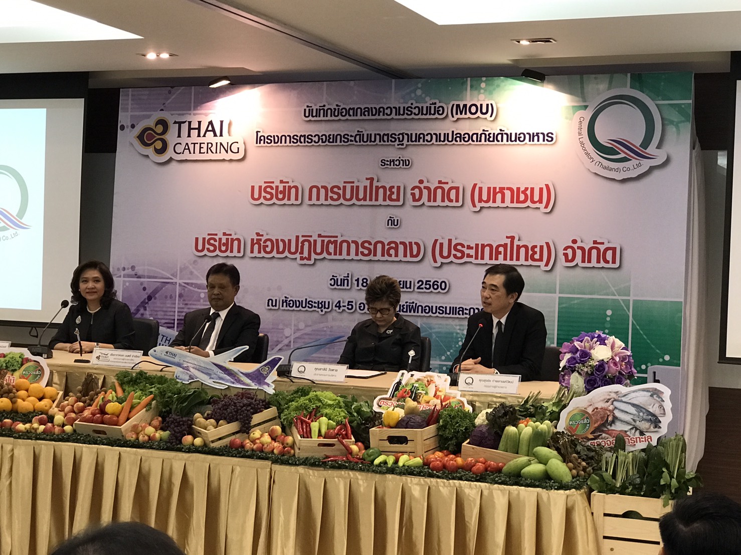 เรืออากาศเอกมนตรี จำเรียง รองกรรมการผู้อำนวยการใหญ่ บมจ.การบินไทย ลงนามบันทึกข้อตกลงกับบริษัท ห้องปฏิบัติการกลาง (ประเทศไทย) จำกัด หรือแล็บประชารัฐ ซึ่งความร่วมมือดังกล่าวจะมีระยะเวลา 2 ปี โดยความร่วมมือตรวจสอบและวิเคราะห์ทางห้องปฏิบัติการส่งเสริมการแลกเปลี่ยนข้อมูลและพัฒนาบุคลากรให้มีความรู้ เพื่อให้อาหารและผลิตภัณฑ์ที่ผลิตปลอดภัยจากสารเคมีและสารตกค้าง หลังการลงนามดังกล่าวครัวการบินไทยที่มีลูกค้ามากกว่า 60 สายการบิน ก็จะดำเนินการให้กระบวนการผลิตผ่านการตวรจสอบช่วยยกระดับมาตรฐาน ซึ่งปัจจุบันกระบวนการผลิตของการบินไทยได้รับการรับรองจากสมาคมขนส่งทางอากาศระหว่างประเทศและองค์การอนามัยโลกอยู่แล้ว ก็จะสร้างความเชื่อมั่นการผลิตมากขึ้น ทั้งนี้ แล็บประชารัฐเป็นหน่วยงานถือห้นุโดยกระทรงการคลังร้อยละ 49 สำนักงานส่งเสริมวิสาหิกจขนาดกลางและขนาดย่อมแห่งประเทศไทย (สสว.) อีกร้อยละ 51 และมีการตรวจสอบและวิเคราะห์ทางห้องแล็บปีละกว่า 400,000 รายการ เพื่อยกระดับมาตรฐานการผลิต ตรวจสอบอาหาร