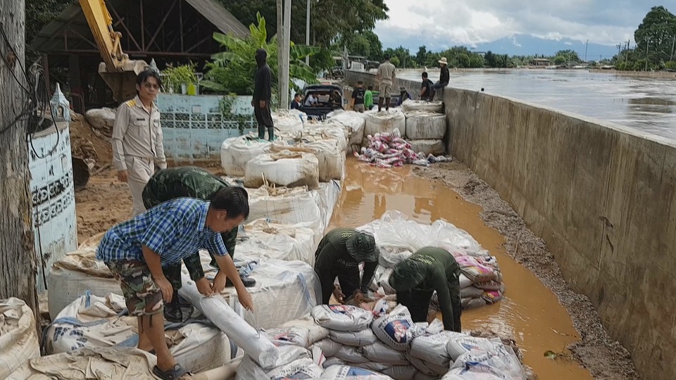 สุโขทัย 18 ก.ย.- แม่น้ำขึ้นสูงผุดด้านหลังวัดไทยชุมพล เจ้าหน้าที่ห่วงปัญหาน้ำท่วม เร่งวางบิ๊กแบ็กป้องกันเขตเทศบาลเมืองสุโขทัยธานี