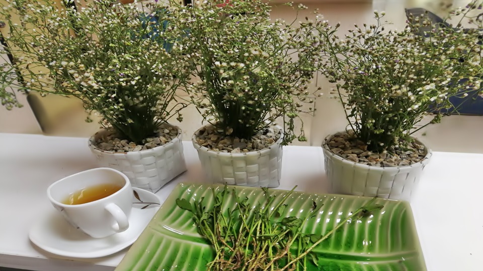 ทั้งนี้ สำหรับชาหญ้าดอกขาวมีรสขมฝาด มีความปลอดภัยค่อนข้างสูง ไม่เป็นสารก่อมะเร็ง ไม่ทำให้เซลล์กลายพันธุ์ จากงานวิจัยมีการค้นพบว่ามีสารสำคัญ 8 ชนิด มีฤทธิ์ยับยั้งสารที่ลดการขับสารโคตินออกทางปัสสาวะ เช่นสารซีวายพี2 เอ6 (CYP2A6 ) สารเอ็มเอโอเอและบี (MAO-A,B) และยังพบว่าในหญ้าดอกขาวยังมีสารนิโคตินเล็กน้อยด้วย ซึ่งจะมีผลต่อระบบประสาทส่วนกลาง ทำให้สารสื่อประสาทคือโดปามีน ( Dopamine) ในกระแสเลือดเพิ่มขึ้น ทำให้ผู้ป่วยอยากยาน้อยลง โดยใช้ทั้ง 4 ส่วน คือดอก ใบ ลำต้น และราก ตากแห้งแล้วนำมาบดเป็นผง .-สำนักข่าวไทย