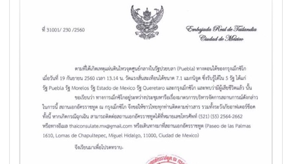 สถานเอกอัครราชทูตไทย ณ กรุงเม็กซิโก โพสต์ข้อความผ่านทางเฟซบุ๊กว่าตามที่ได้เกิดเหตุแผ่นดินไหวจุดศู นย์กลางในรัฐปวยบลา (Puebla) ทางตอนใต้ของกรุงเม็กซิโก เมื่อวันที่ 19 กันยายนที่ผ่านมา เวลา 13.14 น. โดยวัดแรงสั่นสะเทือนได้ขนาด 7.1 แมกนิจูด ซึ่งรับรู้ได้ใน 5 รัฐ ได้แก่ รัฐ Puebla รัฐ Morelos รัฐ Estado de Mexico รัฐ Queretaro และกรุงเม็กซิโก พบว่ามีผู้เสียชีวิตแล้วนั้น และขณะนี้เม็กซิโกอยู่ระหว่างประชุมหารือเรื่องมาตรการบริหารจัดการสถานการณ์ดังกล่าว ในการนี้ สถานเอกอัครราชทูตไทย ณ กรุงเม็กซิโก จึงขอให้ชาวไทยทุกคนติดตามข่าวสาร รวมทั้งระวังภัยอาฟเตอร์ช็อค ทั้งนี้หากเกิดกรณีฉุกเฉิน สามารถติดต่อสถานเอกอัครราชทูตได้ที่หมายเลขโทรศัพท์ (521) (55) 2564-2662 และทางอีเมล thaiconsulate.mx@gmail.com หรือเดินทางมาที่สถานเอกอัครราชทูต (Paseo de las Palmas 1610, Lomas de Chapultepec, Miguel Hidalgo, 11000, Ciudad de Mexico).-สำนักข่าวไทย