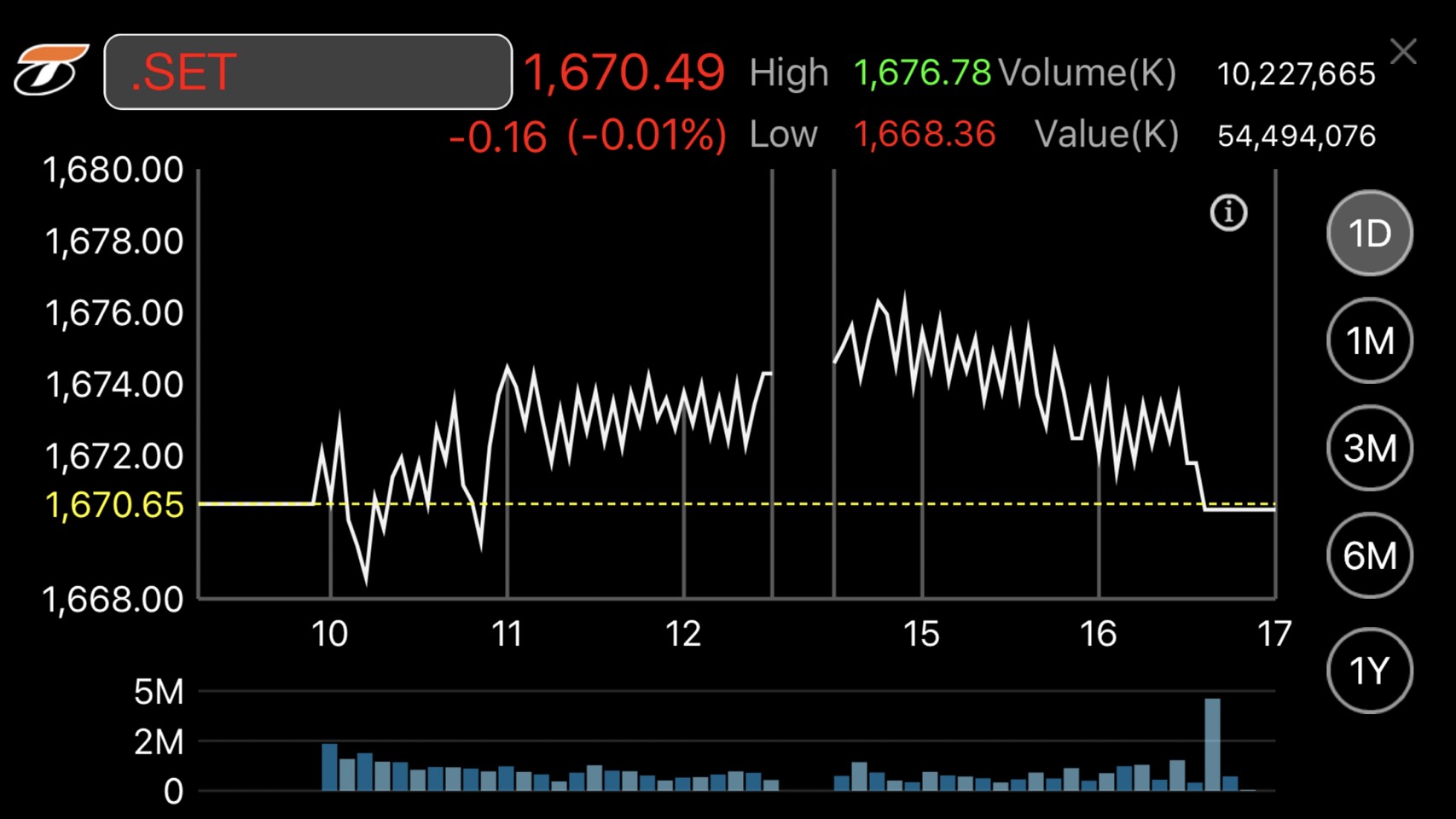 ผู้สื่อข่าวรายงานว่าดัชนีตลาดหลักทรัพย์ปิดที่ระดับ 1,670.49 จุด ลดลง 0.16 จุด หรือร้อยละ 0.01 มูลค่าการซื้อขาย 54,494.08 ล้านบาท โดยการซื้อขายหุ้นวันนี้ดัชนีเคลื่อนไหวทั้งแดนบวก-ลบ แตะจุดสูงสุดที่ระดับ 1,676.78 จุด และต่ำสุดที่ระดับ 1,668.36 จุด
