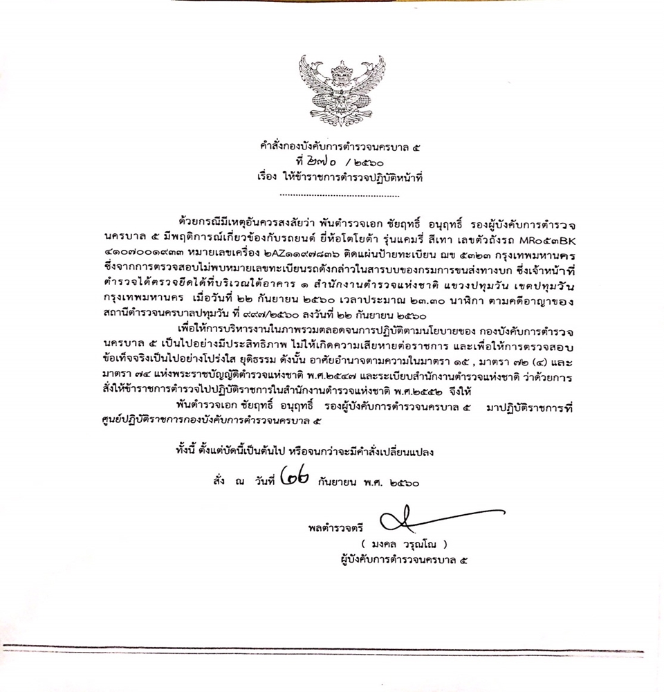 พล.ต.ต.มงคล วรุณโณ ผู้บังคับการตำรวจนครบาล 5 มีคำสั่งให้ พ.ต.อ.ชัยฤทธิ์ อนุฤทธิ์ รองผู้บังคับการตำรวจนครบาล 5 มาปฏิบัติราชการที่ศูนย์ปฏิบัติการกองบังคับการตำรวจนครบาล 5 ด้วยมีเหตุอันควรสงสัยว่าเกี่ยวข้องกับรถยนต์ ยี่ห้อโตโยต้า รุ่นคัมรี่ สีเทา ทะเบียน ฌข 5323 เชื่อมโยงพา น.ส.ยิ่งลักษณ์ ชินวัตร อดีตนายกรัฐมนตรี หลบหนี และเพื่อให้ตรวจสอบข้อเท็จจริงอย่างโปร่งใส ยุติธรรม โดยคำสั่งให้มีผลทันที