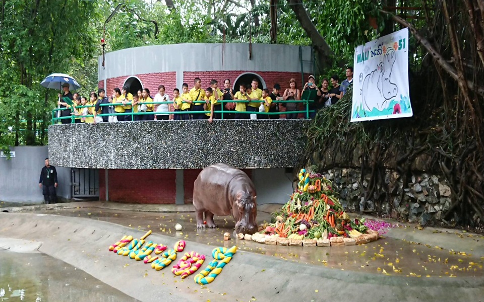 แม้ฝนโปรยปรายลงมาไม่ขาดสาย แต่เด็กนักเรียนจากโรงเรียนต่างๆ ที่เดินทางมาทัศนศึกษาก็ไม่ยอมหลบฝน ยังคงตื่นเต้นและสนุกสนานกับกิจกรรมสุดพิเศษที่สวนสัตว์ดุสิตจัดงานฉลองครบรอบ 51 ปี รับขวัญ “แม่มะลิ” ฮิปโปโปเตมัสที่มีอายุยืนที่สุดในประเทศไทย พร้อมกับร่วมกันร้องเพลงแฮปปี้เบิร์ธเดย์ให้กับสัตว์อาวุโส ดาวเด่นแห่งสวนสัตว์ โดยมีนายสุเมธ กมลนรนาถ รองผู้อำนวยการองค์การสวนสัตว์ เป็นประธานจัดงานและนำผักผลไม้ใส่ตะกร้า จัดทำเป็นเค้กก้อนโตให้แม่มะลิ และหลานมะขาม ออกมากินผักผลไม้ที่จัดเตรียมไว้กันอย่างเอร็ดอร่อย