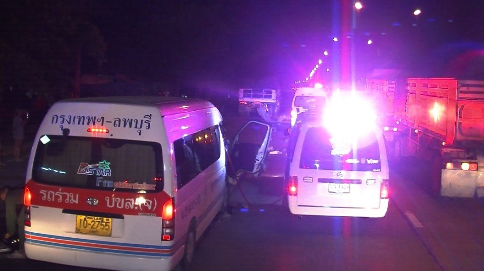 ร.ต.อ.อุทัย จอมพุทรา ร้อยเวรสอบสวน สภ.พระพุทธบาท จ.สระบุรี พร้อมมูลนิธิร่วมกตัญญู ให้การช่วยเหลืออุบัติเหตุ ตั้งแต่เช้ามืดวันนี้ (25 ก.ย.) รถตู้โดยสาร สายกรุงเทพ-ลพบุรี ทะเบียน 10-2755 ลพบุรี ชนกับรถบรรทุกพ่วง บนถนนพหลโยธิน ฝั่งขาเข้าสระบุรี ต.พุคำจาน อ.พระพุทธบาท จ.สระบุรี เจ้าหน้าที่ต้องใช้อุปกรณ์ตัดถ่างนำคนขับออกจากรถตู้โดยสารส่งโรงพยาบาล เป็นชายอายุ 45 ปี ส่วนผู้โดยสารบาดเจ็บเล็กน้อย 3 ราย