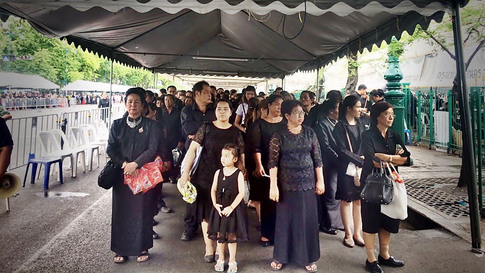 ขณะที่ประชาชนทุกคนที่เดินทางมากราบถวายบังคมพระบรมศพยังตั้งใจเเละไม่ย่อท้อ เเม้อากาศร้อนเเละเริ่มมีอาการอ่อนล้าจากการรอคอยที่ยาว นาน เช่นคุณยาย 3 คนซึ่งเป็นพี่น้องครอบครัวเดียวกัน เดินทางมาจากจ.กำเเพงเพชรตั้งเเต่ 23.00 น.วานนี้ เพื่อมาเข้ากราบถวายบังคมพระบรมศพเป็นครั้งที่8 บอกว่า ตั้งใจจะมาอีกเรื่อยๆ เเม้จะรอนานกว่า 10 ชั่วโมงเเละมีจำนวนคนมามากขึ้นเรื่อยๆเเต่ความเหนื่อยทั้งหมดปลิดทิ้งไปเมื่อได้เข้ากราบถวายบังคมพระบรมศพ ถึงเเม้จะเป็นช่วงเวลาสั้นๆก็ตาม เเต่ก็อยากมาอยู่ใกล้ๆกับพระองค์มากที่สุดเพราะรักพระองค์เหนือสิ่งอื่นใด