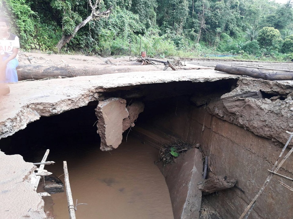 สถานการณ์ฝนตกหนักมาหลายวันใน จ.แม่ฮ่องสอน โดยเฉพาะบนยอดดอยมีปริมาณน้ำสะสมมาก และเกิดน้ำป่าไหลหลาก เมื่อคืนที่ผ่านมา (26 ก.ย.) กัดเซาะใต้ถนนเป็นโพรงกว้าง บริเวณสะพานข้ามลำห้วยแม่สามแลบ หมู่ 1 ต.แม่สามแลบ อ.สบเมย ทำให้ผิวถนนด้านบนทรุดเป็นหลุมลึก 1.5 เมตร กว้าง 2 เมตร สามารถสัญจรได้เพียงรถจักรยานยนต์เท่านั้น และต้องขับขี่ด้วยความระมัดระวังมากขึ้น เนื่องจากสภาพผิวถนนเหลือเพียงแผ่นซีเมนต์เท่านั้น เกรงว่าหากรับน้ำหนักตลอดเวลาอาจทรุดตัวมากกว่าเดิม