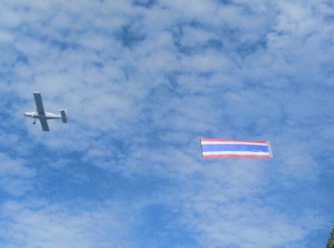ขณะเดียวกัน น.อ.สรวิชญ์ สุรกุล ผู้บังคับการกองบิน 5 อ.เมือง และข้าราชการทหารตั้งแถวเคารพธงชาติ บริเวณหน้าประตูทางเข้าออกกองบิน 5 จากนั้นฝูงบิน 501 นำเครื่องบินพีซเมกเกอร์ หรือเครื่องบินโจมตีธุรการ จำนวน 4 ลำ บินปล่อยควันสีธงไตรรงค์พร้อมผืนธงชาติสวยงามโดดเด่นกลางเวหาอ่าวประจวบคีรีขันธ์ เพื่อร่วมเฉลิมฉลองประวัติศาสตร์ของชาติไทย.-สำนักข่าวไทย
