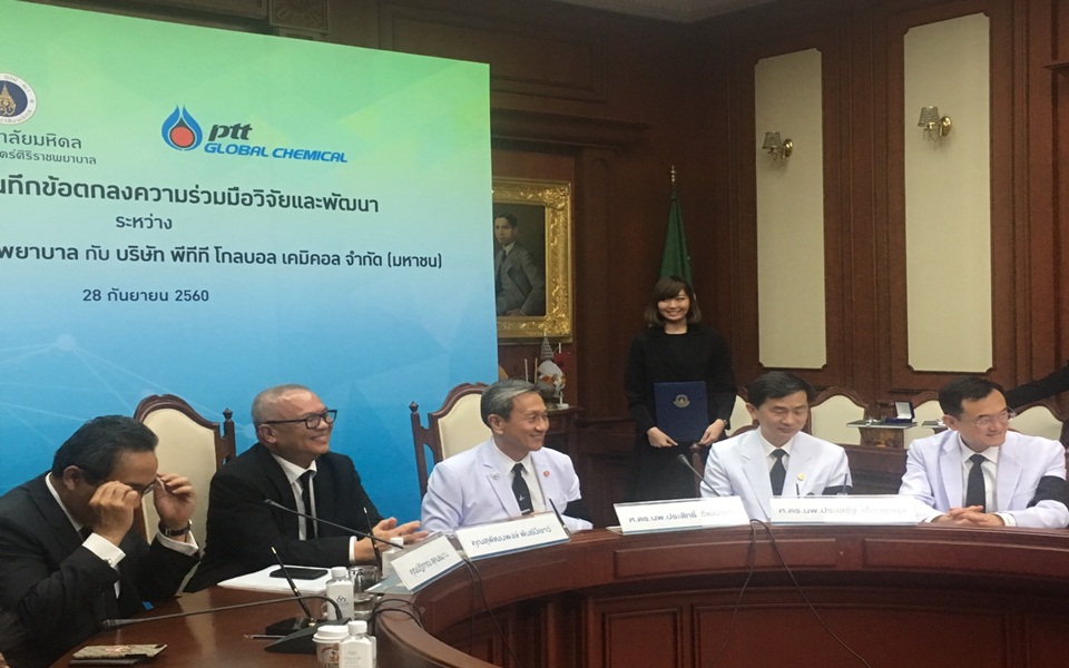 นพ.ประสิทธิ์ วัฒนาภา คณบดีคณะแพทยศาสตร์ ศิริราชพยาบาล มหา วิทยาลัยมหิดล พร้อมด้วยนาย สุพัฒน พันธ์เชาว์ ประธานเจ้าหน้าที่บริ หารและกรรมการผู้จัดการใหญ่ บริษัท พีทีที โกลบอล เคมิคอล จำกัด (มหาชน) (PTTGC ) ลงนามบันทึกความร่วมมือในการวิจัยและพัฒนานวัตกรรมเครื่องมือและอุปกรณ์ทางการแพทย์ เพื่อสร้างประโยชน์สูงสุดให้กับผู้ป่วยและประชาชน โดยถือเป็นความร่วมมือระหว่างหน่วยงานภาครัฐและเอกชน นำความรู้มาแลกเปลี่ยนเพื่อให้เกิดการพัฒนา ในการผลิต คัดเลือกวัสดุสิ้นเปลืองที่ใช้ภายในศิริราช เพื่อนำมาจัดทำ ลดการนำเข้าผลิตภัณฑ์จากต่างประเทศ เบื้องต้นมี 22 โครงการ สำหรับผลิต ภัณฑ์ที่ใช้แล้ว ได้แก่ ถุงวัดปริมาณเลือดหลังคลอด สำหรับผู้ที่คลอดธรรม ชาติ เพื่อวิเคราะห์ปริมาณการเสียเลือดระหว่างการคลอด และลดจำนวนผู้เสียชีวิตจากการคลอดธรรมชาติ (ตกเลือด ) ซึ่งมีปริมาณการใช้ 4 แสนบาทต่อปี โมเดล สื่อการเรียนการสอนเพื่อลดการนำเข้าสื่อจากการเรียนการสอนแบบสามมิติจากต่างประเทศ ทำให้นักศึกษาแพทย์ และสาขา วิชาที่เกี่ยวข้องการเรียนแบบเสมือนจริง และเฝือกแบบ 3 D.Printer ของ PTTGC.-สำนักข่าวไทย