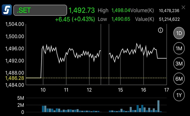 กรุงเทพ ฯ 20 ต.ค. – ผู้สื่อข่าวรายงานว่าดัชนีตลาดหุ้นไทยปิดการซื้อขายที่ระดับ 1,492.73 จุด เพิ่มขึ้น 6.45 จุด หรือร้อยละ 0.43 มูลค่าการซื้อขาย 51,214.62 ล้านบาท ดัชนีเคลื่อนไหวแดนบวกตลอดวัน โดยสูงสุดของวันที่ระดับ 1,498.04 จุด และต่ำสุดของวันที่ 1,490.65 จุด
