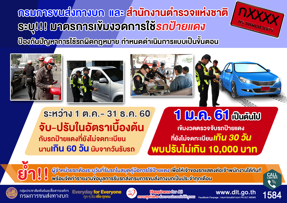 วัน นับจากวันรับรถปรับทันที 1,000 บาท และเข้มขึ้นตั้งแต่ 1 มกราคม 2561 รถป้ายแดงต้องจดทะเบียนภายใน 30 วัน หากเกินปรับตามดุลพินิจไม่เกิน 10,000 บาท